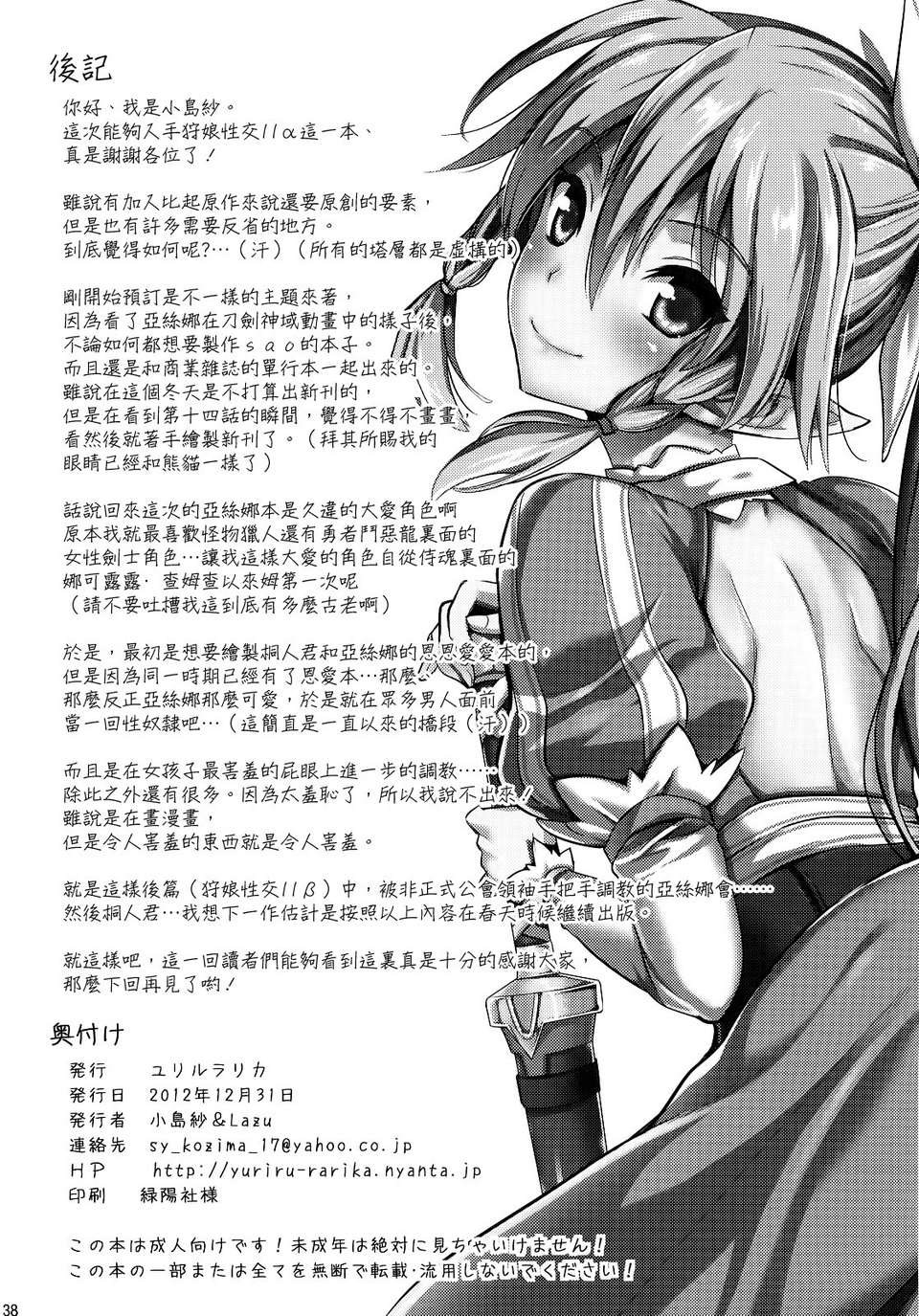 首頁>同人誌>漢化>(C83) [ユリルラリカ (小島紗, Lazu)] 狩娘性交IIα わたし…犯されて性癖に目覚めました (ソードアート・オンライン) [空気系☆漢化]>38