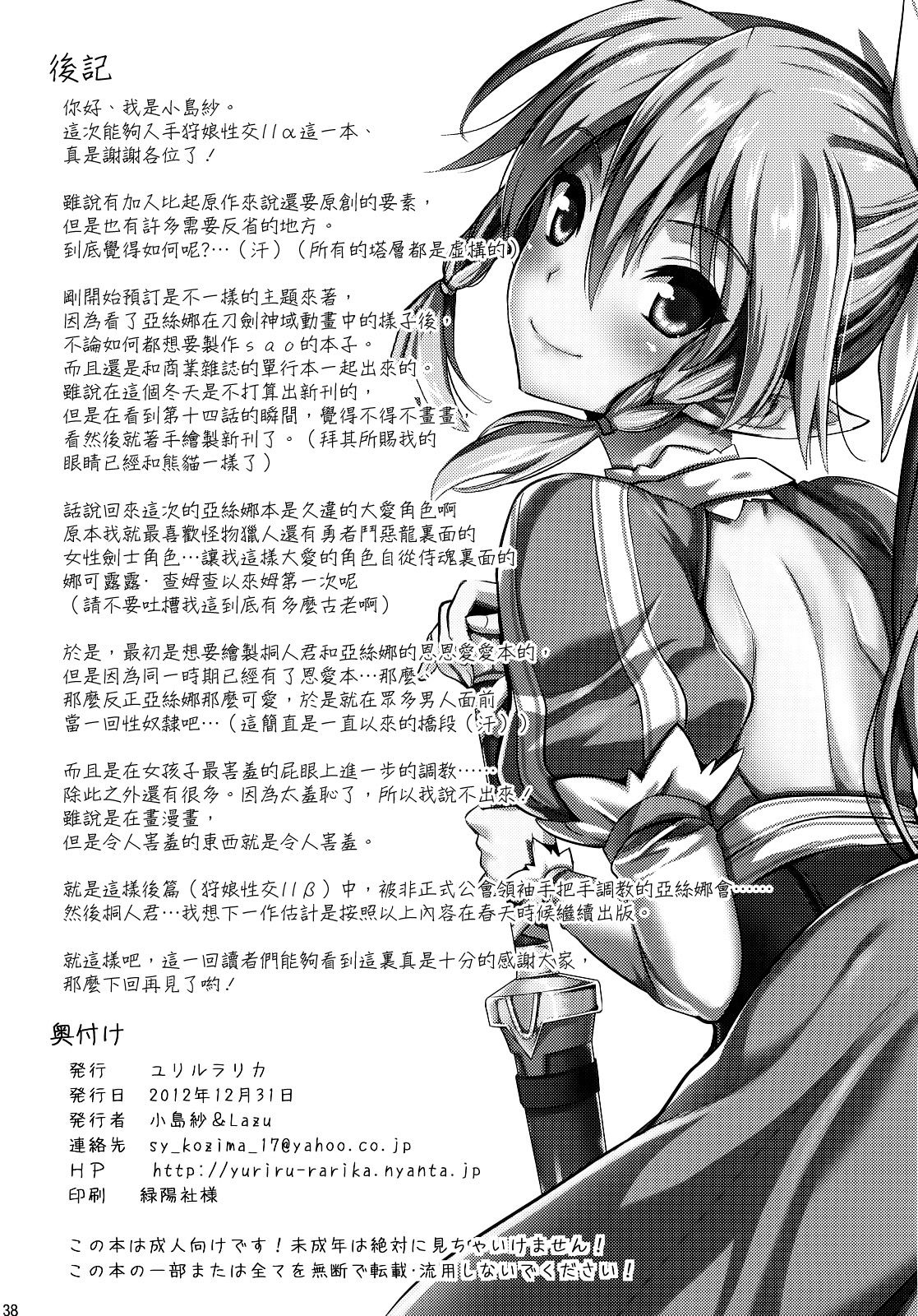 首頁>同人誌>漢化>(C83)[ユリルラリカ(小岛纱,Lazu)]猎娘性交IIαわたし…犯されテ性癖ニ目覚めました(ソードアートめました)ソードアートヨ国·奥辣特 [中国翻訳]>37